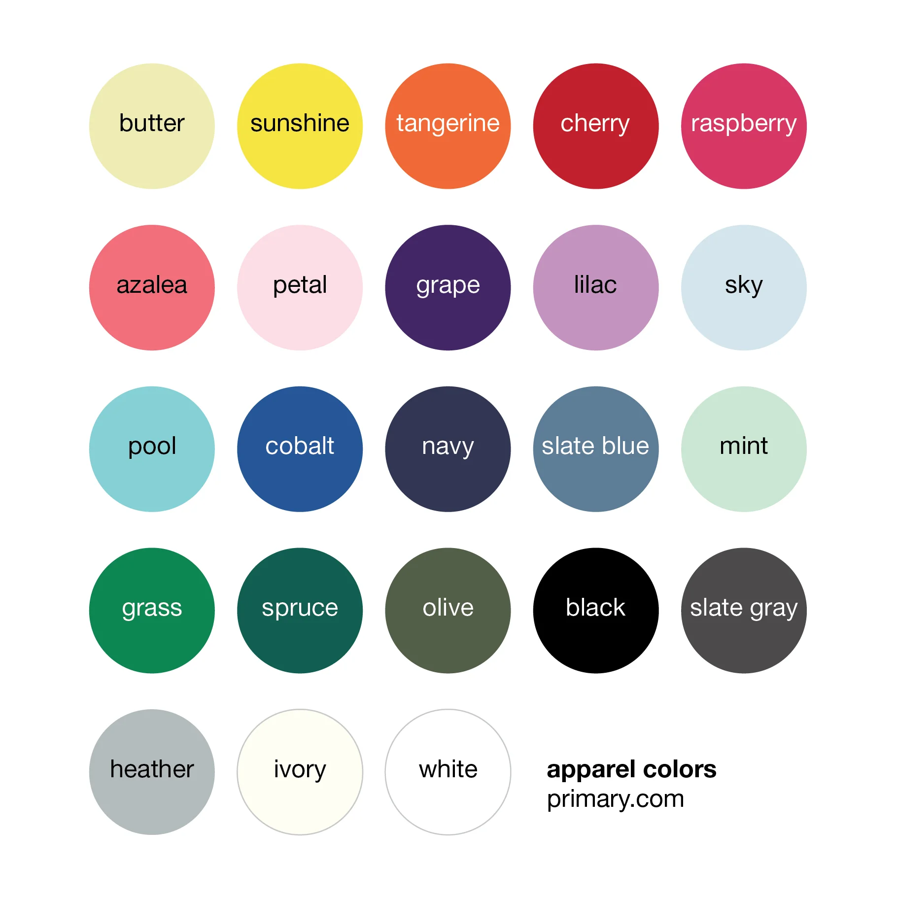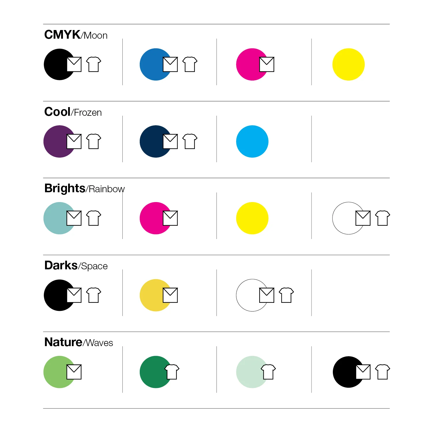 All sets have specific color palettes selected for that theme and based on apparel and envelope colors. Below is a breakdown of palettes for apparel and envelopes.